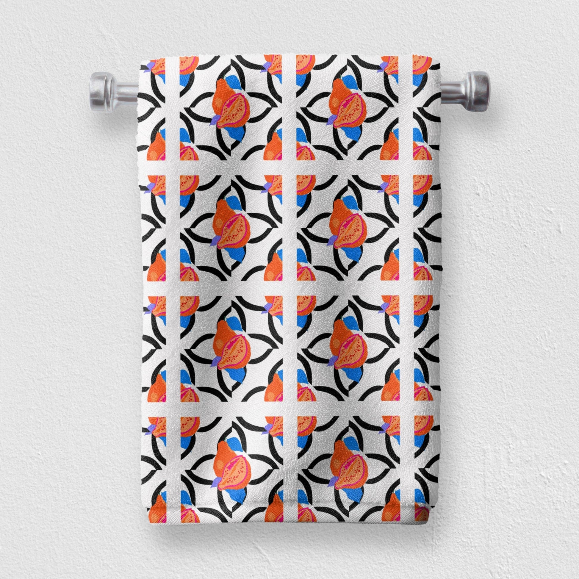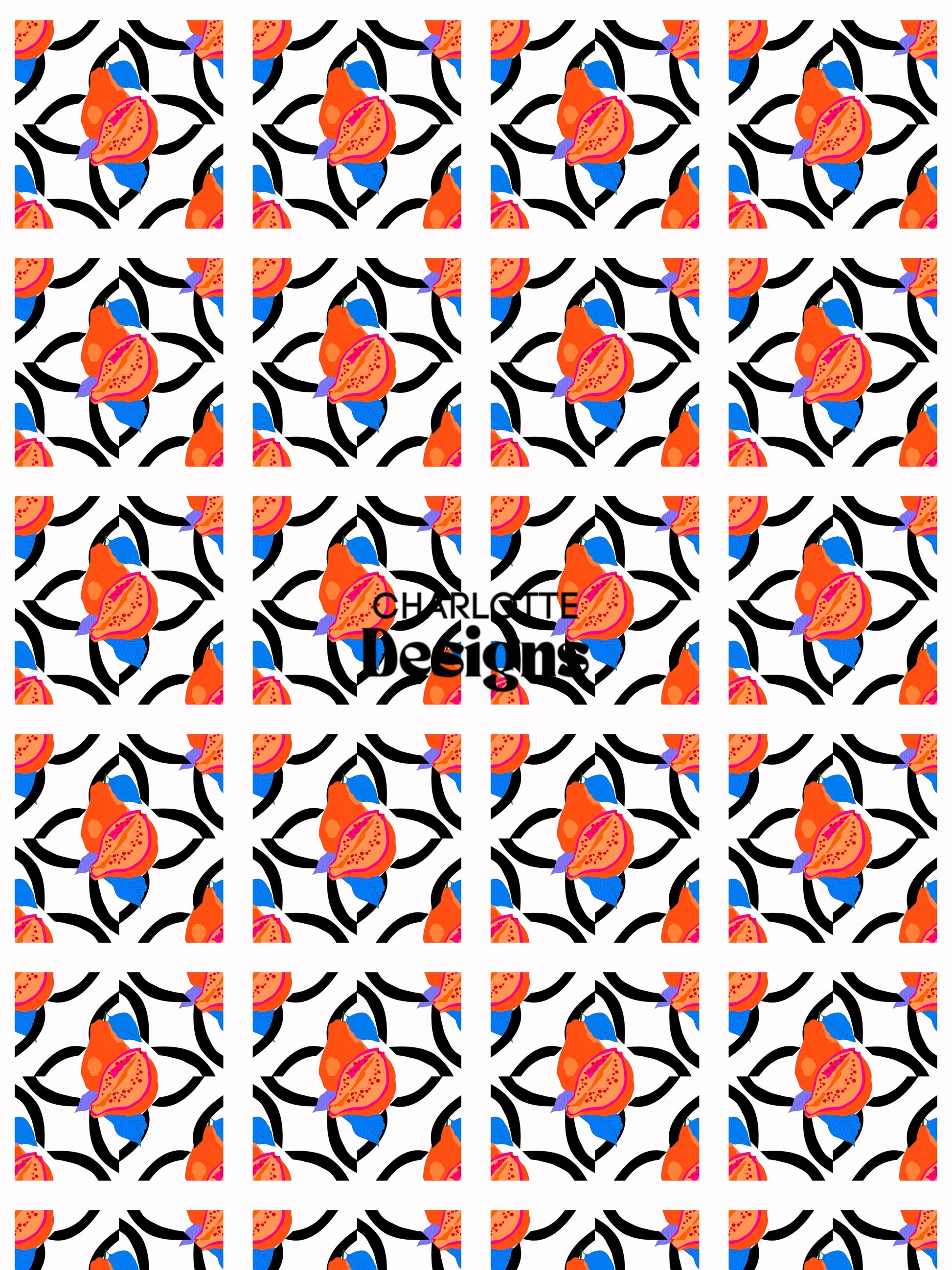 Talavera™ is a bold, high-contrast surface pattern inspired by traditional Spanish and Mexican Talavera tilework, reimagined for contemporary interior and accommodation spaces. Part of the Casita Tropicana collection, this design combines classic tile geometry with hand-drawn guava illustrations that add a playful pop of colour and a tropical twist. The contrast of graphic black and white with vibrant fruit details creates a lively yet timeless look, perfect for wallpapers, soft furnishings, tiles, and decorative interior applications.